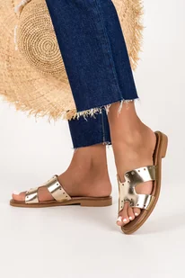 Złote klapki skórzane damskie błyszczące płaskie z ozdobną podeszwą PRODUKT POLSKI Casu 40326