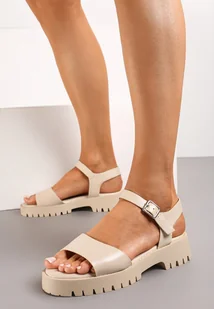 Beżowe Sandały na Grubej Podeszwie z Gładkiej Ekoskóry ze Sprzączką Drusa
