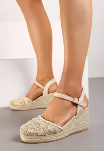 Beżowe Sandały na Koturnie Ozdobione Plecionką Zapinane na Sprzączkę Waldoni