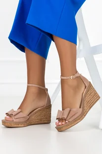 Beżowe sandały skórzane damskie espadryle na koturnie z zakrytą piętą pasek wokół kostki kokarda PRODUKT POLSKI Casu 2651-339-N