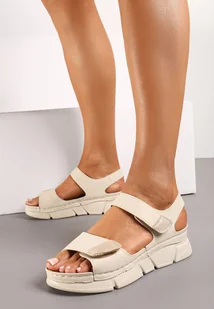 Beżowe Sandały z Wkładką ze Skóry Naturalnej Zapinane na Rzep Yrissa