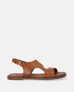 Sandały wykonane z gładkiej skóry naturalnej w brązowym kolorze. Cholewka o prostej linii, z wycięciami po bokach i szerokim paskiem wzdłuż śródstopia. Tylny pasek, zapinany na złotą sprzączkę, umożliwia indywidualne dopasowanie. Model osadzony na cienkiej podeszwie, wykończony skórzaną wkładką i otwartymi, zaokrąglonymi noskami. otwarte, zaokrąglone noski regulowany pasek na złotą sprzączkę boczne wycięcia miękka, skórzana wkładka