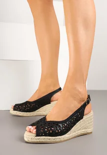 Czarne Ażurowe Sandały na Koturnie z Plecionki z Motywem Kwiatowym Nevoriae