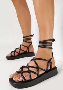 Czarne Płaskie Sandały z Wiązaniem przy Kostce Ozlana