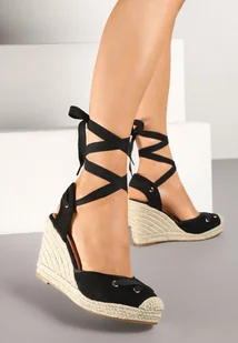 Czarne Sandały Espadryle na Plecionym Koturnie z Wiązaniem Wokół Kostki Adivnia