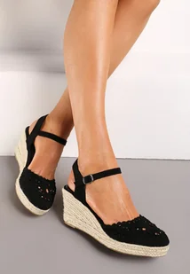 Czarne Sandały na Koturnie Ozdobione Plecionką i Ażurowym Wzorem Vexia