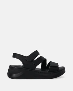 Czarne sandały wykonane z gładkiej skóry naturalnej na podwyższonej koturnie. Trzy szerokie paski zapinane na rzepy umożliwiają indywidualne dopasowanie do stopy. Model łączy minimalistyczny wygląd z codzienną wygodą. trzy paski z regulacją na rzep profilowana wkładka lekka, elastyczna konstrukcja naturalna skóra wsuwany fason