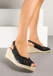 Czarne Sandały na Plecionym Koturnie z Ażurową Cholewką z Kwiatowym Motywem Nevianelle