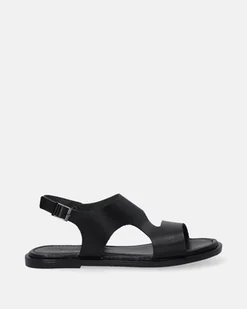 Czarne sandały damskie wykonane ze skóry naturalnej. Cholewka o geometrycznej linii z wycięciami po bokach nadaje modelowi nowoczesny charakter. Szeroki pasek na palcach i lekko zaokrąglony nosek dopełniają minimalistyczną formę. Tylny pasek z klamrą umożliwia dopasowanie, a całość osadzona jest na płaskiej podeszwie ze skórzaną wkładką. otwarte, zaokrąglone noski regulowany pasek na sprzączkę boczne wycięcia miękka, skórzana wkładka