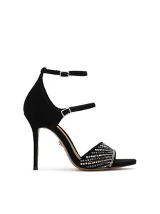 Czarne zamszowe sandały na szpilce z transparentnym paskiem i dżetami - 39