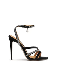 <p>Efektowne <strong>sandały damskie</strong> wykonane z wysokiej jakości <strong>tkaniny</strong> powstały z myślą o odważnych kobietach lubiących stawiać na wyraźne dodatki. Cienkie paski zdobione licznymi cyrkoniami pięknie połyskują na tle czarnej tkaniny, przyciągając zaciekawione spojrzenia. Całość dopełnia wysoka szpilka, która wysmukla sylwetką dodając jej kilka centymetrów. Klasyczny fason w nowoczesnym wydaniu przepięknie dopełni wieczorowe stylizacje. <