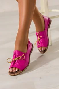 Fuksjowe sandały skórzane damskie zabudowane ze złotą kokardą PRODUKT POLSKI Casu 2660-073