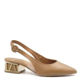 Karmelowe, eleganckie sandały bez pięty zapinane na sprzączkę w kolorze obuwia. Obcas jest niski wynosi około 4 cm. Obuwie wykonano z naturalnej skóry licowej. Noski butów w delikatny szpic. Po bokach butów wszyto elementy transparentne.