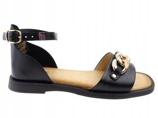 Czarne sandały skórzane damskie płaskie ze złotym liściem PRODUKT POLSKI Casu 933