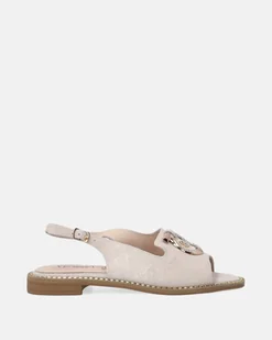 Różowe sandały damskie wykonane z miękkiego zamszu o subtelnym połysku. Na szerokim pasku z przodu umieszczono elegancką ozdobę z metalicznym wykończeniem i subtelnymi kryształkami, które dodają blasku. Płaska podeszwa została ozdobiona złotym akcentem wzdłuż krawędzi, podkreślając lekki i kobiecy charakter modelu. zaokrąglone noski miękka, skórzana wkładka ozdobny detal z kryształkami regulowany pasek na sprzączkę w złotym odcieniu podeszwa wykończona złotym otokiem