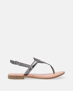 Sandały japonki wykonane z miękkiej skóry koziej w kolorze srebrnym. Kobiecy i wygodny model, który przyciąga uwagę efektowną aplikacją z połyskujących kamieni. Sandały to stylowe uzupełnienie letnich outfitów. błyszcząca aplikacja skórzana wyściółka przeszywany otok regulowany pasek z klamerką metaliczny odcień