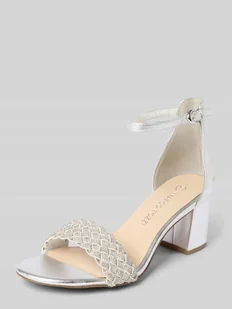 Sandały damskie MARCO TOZZI;Zaokrąglony kształt;Sprzączka;Obszycie z kamieni stras;Obcas słupek;Lekko fakturowana podeszwa;Wysokość obcasa w rozmiarze 40: 7 cm;Wysokość cholewki w rozmiarze 40: 10 cm;Szerokość cholewki w rozmiarze 40: 6 cm