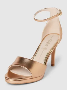 Sandały damskie Buffalo;Zaokrąglony czubek;Jednolity kolor;Model ‘RONJA’;Wąskie paski;Obcas szpilka;Detal z logo;Wysokość obcasa w rozmiarze 40: 10 cm;Wysokość cholewki w rozmiarze 40: 10 cm;Szerokość cholewki w rozmiarze 40: 10 cm