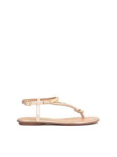 <p><strong>Sandały japonki </strong>to atrakcyjny fason, który prezentuje się na nodze bardzo zgrabnie. Złoty kolor podkreśla ich kobiecy charakter oraz elegancką stylistykę. Paski wykonane z wysokiej jakości <strong>skóry licowej</strong> przechodzące wzdłuż śródstopia oraz wokół kostki tworzą ciekawy efekt wizualny. Złota metalowa ozdoba przełamuje minimalizm. </p> <ul> <li>Wyściółka z semianilinowej skóry owczej zapewnia wyjątkow