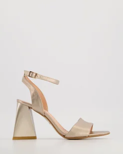 Eleganckie sandały na geometrycznym obcasie to propozycja dla miłośniczek stylowych dodatków. Wykonane z gładkiej skóry bydlęcej z metalicznym, złotym połyskiem świetnie sprawdzą się podczas wielkiego wyjścia. zaokrąglone, odkryte noski skórzany pasek z przodu regulowane zapięcie na wysokości kostki geometryczny, malowany obcas wyściółka ze skóry naturalnej