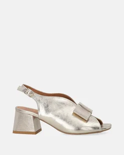 Złote skórzane sandały wyróżniają się nowoczesnym, geometrycznym obcasem o lekko trapezowym kształcie z połyskującym nadrukiem. Kwadratowe, odkryte noski eksponują palce, nadając sylwetce buta wyrazistej, architektonicznej formy. Na przodzie ozdobna, stylowa kokarda stanowi finezyjny, kobiecy akcent, podkreślający elegancję i oryginalność projektu. Regulowany pasek przy pięcie umożliwia idealne dopasowanie, a lekko profilowana wkładka dba o komfort podczas całodziennego noszenia. zabudowana cholewka z odkrytą piętą i noskiem pasek na piętę regulowany za pomocą sprzączki oryginalny, geometryczny