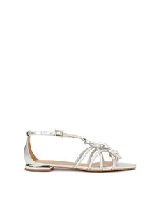 Płaskie sandały wykonane ze srebrnej naturalnej skóry to stylowy i wyrazisty wybór na ciepłe dni. Model ten charakteryzuje się eleganckim fasonem z zabudowaną piętą, co zapewnia dodatkowe wsparcie i stabilność podczas noszenia. Sandały posiadają zapinany pasek przy kostce, który nie tylko dodaje stylu, ale również gwarantuje idealne dopasowanie do stopy. Uwagę przyciągają efektowne, przeplatane paski z przodu, które tworzą oryginalny i nowoczesny design. Wysokiej jakości skóra oraz staranne wykonanie sprawiają, że te sandały są nie tylko komfortowe, ale również trwałe, idealnie nadając się do codziennych i eleganckich stylizacji.
