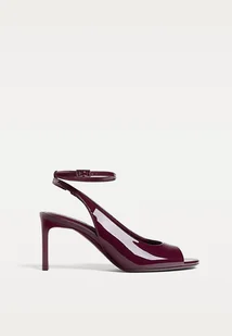 Czółenka z odkrytą piętą i otwartym noskiem. Efekt lakierowany. Dostępne w kolorze burgundowym. Zapinane na sprzączkę na pasku wokół kostki. Wysokość obcasa 7,5 cm.