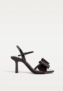 Lakierowane sandały na obcasie. Ozdobny węzeł na podbiciu. Zapięcie na sprzączkę przy pasku wokół kostki. Dostępne w kolorze brązowym. Wysokość obcasa: 7 cm.