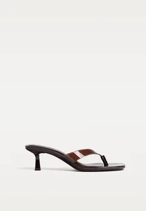 Sandały na obcasie Winylowe z paskiem na podbiciu z miejscem na palec. Dostępne w kolorze brązowym. Wysokość obcasa: 7 cm.