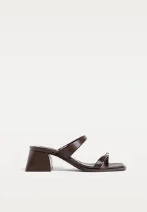 Sandały na obcasie z miejscem na palec i metalowym elementem. Pasek na podbiciu. Dostępne w kolorze brązowym. Wysokość obcasa 5 cm.