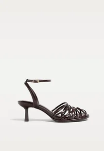 Sandały rzymianki na obcasie. Dostępne w kolorze brązowym. Zapięcie na sprzączkę na pasku wokół kostki. Wysokość obcasa: 6 cm.