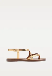 Damskie sandały na płaskiej podeszwie ze skórzanymi paskami, typu japonki. Pasek wokół kostki ze sprzączką. Dostępne w złotym kolorze. Wysokość podeszwy: 1 cm.