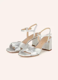 Delikatnie groszkowana skóra. Skóra o metalicznym wyglądzie. Pasek na kostkę z klamrą ze szpilką. Skrzyżowane, szerokie paski z przodu. Zaokrąglony kwadratowy kształt noska.