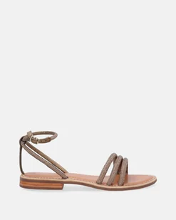 Sandały damskie wykonane ze skóry bydlęcej w kolorze złotym. Klasyczny krój wyróżniony ozdobnymi paskami z błyszczących kamieni. Sprawdzą się jako dodatek do sukienek, spódnic lub szortów. metaliczny odcień skórzana wyściółka przeszywany otok zaokrąglony nosek błyszczące kamienie lekka, elastyczna podeszwa