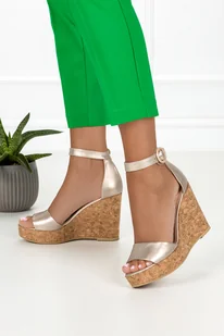Złote sandały skórzane damskie na ozdobnym koturnie PRODUKT POLSKI Casu 2339