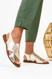Złote sandały skórzane damskie płaskie z paskami na krzyż PRODUKT POLSKI Casu 3012-0