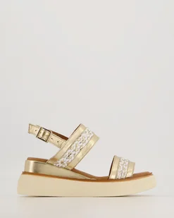 Sandały na koturnie wykonane ze skóry cielęcej. Cholewkę tworzą metaliczne paski ozdobione plecioną skórą, które pięknie się prezentują i stabilnie trzymają stopę. Modne i komfortowe będą doskonałą bazą do letnich stylizacji. miękka, skórzana wkładka połyskujące paski stabilny koturn regulowane zapięcie na klamrę w okolicy kostki kwadratowe noski