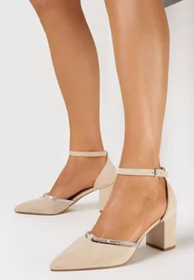 Beżowe Czółenka na Niskim Słupku z Ekozamszu z Błyszczącym Paskiem Amiresna