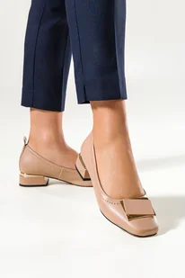 Beżowe czółenka skórzane damskie na dekoracyjnym niskim klocku z ozdobą Casu SL24X10-A-40