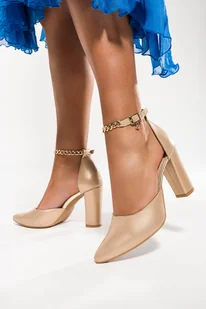 Beżowe czółenka skórzane damskie na słupku ze złotym łańcuszkiem wokół kostki PRODUKT POLSKI Casu 2447-147-35