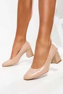 Beżowe czółenka skórzane damskie na szerokim ozdobnym klocku PRODUKT POLSKI Casu 2966-546-36