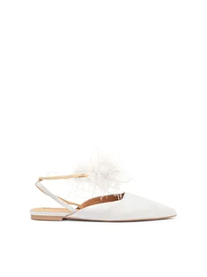 <p><span><strong>Białe czółenka</strong> na płaskiej podeszwie </span><span>to propozycja dla Panien Młodych, które poszukują komfortowego, a zarazem modnego obuwia na wyjątkowy dzień. Zabudowany nosek w szpic wykonany z <strong>tkaniny </strong>w połączeniu z łańcuszkiem oplatającym kostkę prezentuje się nieszablonowo i elegancko. Całość efektownie dopełniają frywolne pióra przymocowane do łańcucha. Finezyjne czółenka będą ciekawym dopeł