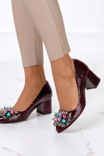 Bordowe czółenka lakierowane z kryształkami wzór wężowy POLSKA SKÓRA Casu 3184-40