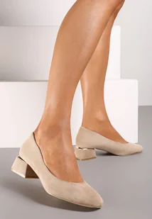 Ciemnobeżowe Czółenka z Metaliczną Wstawką na Niskim Słupku oraz Skórzaną Wkładką Kariala