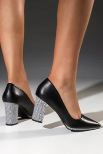 Czarne czółenka damskie na ozdobnym słupku z geometrycznym wzorem skórzana wkładka Casu D25X6-B