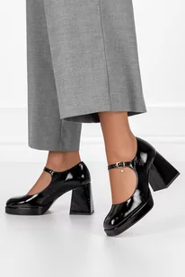Czarne czółenka skórzane damskie lakierowane Mary Jane na klocku z paskiem ozdoba PRODUKT POLSKI Casu 2661-600