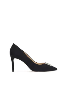 <p><strong>Czółenka </strong>uszyte z miękkiego i przyjemnego w dotyku <strong>zamszu </strong>to uniwersalny, ponadczasowy fason idealny na różne okazje. Czarne szpilki z noskami w szpic wzbogacone zostały dużą, złotą ozdobą przedstawiającą monogram KAZAR. Wysoką jakość, klasyczną elegancję i nienaganne wykonanie doceni każda kobieta. </p> <ul> <li>Wyściółka wykonana z semianilinowej skóry owczej to gwarancja wygody i higienic