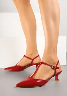 Czerwone Czółenka na Obcasie Typu Kaczuszka z Ozdobnymi Paskami Pellene