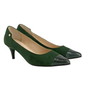 Czółenka skórzane na szpilce Eleganckie czółenka ze skóry naturalniej, zamszowej, na niskiej szpilce, na przodzie skóra licowa, ozdobne wycięcie. Wygodne, nietuzinkowe, idealne do codziennej styliza ...