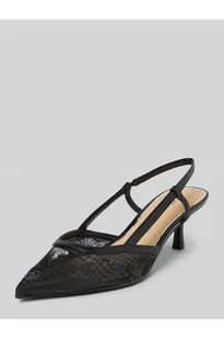 Czółenka z odkrytym zapiętkiem marki Guess, model Yanno, prezentują się w półprzezroczystym wydaniu, które dodaje lekkości i pozwala na wszechstronne stylizacje. Dzięki zwężającemu się ku przodowi kształtowi powstaje elegancki akcent, a gładka podeszwa wspiera komfort chodzenia. Subtelna aplikacja z logo dopełnia spójny design.